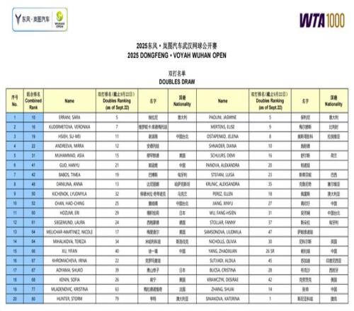 巴黎奥运会女双金牌得主、今年法网女双冠军埃拉尼/保利尼领衔出战武网女双,中国金花张帅将携手前女双“球后”梅拉德诺维奇亮相,谢淑薇/奥斯塔彭科、安德列娃/施耐德等组合也颇具看点。
