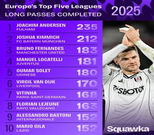 2025年,随着赛季的结束,数据机构Squawka公布了五大联赛中球员成功长传的统计情况。在所有球员中,富勒姆后卫安诺森凭借235次成功长传位居榜首,表现尤为突出。