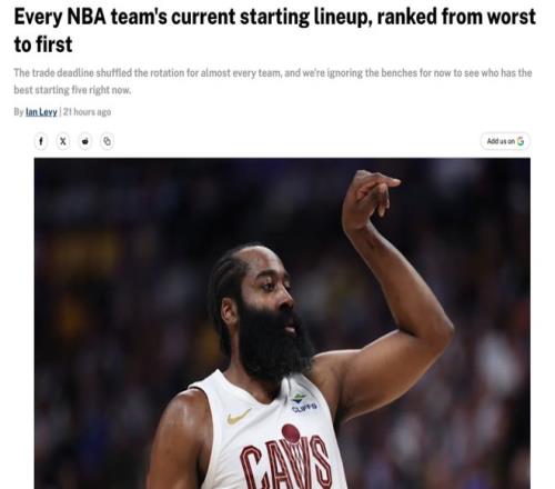美媒评30队首发实力!骑士获哈登后飙升第4火箭第7湖人17存争议