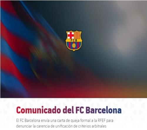 最近两个赛季,西甲双雄似乎都在裁判的问题上有很多的不满,上赛季皇马TV事件就闹得沸沸扬扬,巴萨最近也因为国王杯半决赛输给马竞的判罚正式发起了投诉。在输球1天之后,巴萨官方宣布已经正式向西班牙足协发起了投诉信,表达了对裁判判罚尺度不统一的不满,文件的核心就是巴萨遭到了裁判不公正待遇,多次在巴萨的比赛当中出现了误判的情况,导致球队丢了很多分。