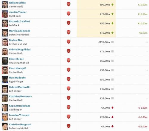 阿森纳球员身价变动:萨利巴上涨1000万欧,萨卡下跌1000万欧 -