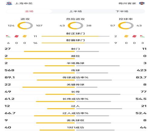 申花61梅州全场数据:申花狂轰27脚射门,控球率57